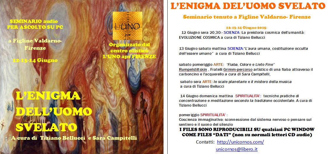 domenica mattina SPIRITUALITA’: tecniche pratiche di concentrazione e meditazione secondo la tradizione occidentale. Venerazione e calma interiore. Preparazione ed Illuminazione . Controllo di pensieri e sentimenti: esercizi immaginativi. A cura di Tiziano Bellucci