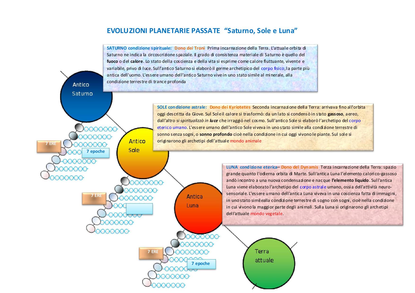 – saturno: Il primo stato di coscienza fu miliardi di anni fa: uno stato di trance: minerale: medianico: Coscienza saturnia=onniscienza: percezione telepatica, partecipazione inconscia ai fatti che accadono dalla terra sino alla zona zodiacale. – sole: il secondo stato fu lo stato di sonno senza sogni o vegetale: coscienza solare o percezione telepatica e partecipazione inconscia a qualsiasi cosa accade nel sistema solare. – luna: il terzo stato fu lo stato di sogno o animale: coscienza lunare o percezione telepatica e partecipazione inconscia ai fatti accaduti nell’orbita della luna – terra: il quarto stato: attuale o percezione di ciò che avviene solo tramite i propri sensi – giove: il quinto stato immaginazione (stato lunare cosciente) coscienza psichica – venere: il sesto stato ispirazione (stato solare cosciente) coscienza iperpsichica – vulcano: il settimo stato intuizione (stato saturnio cosciente) coscienza onnisciente